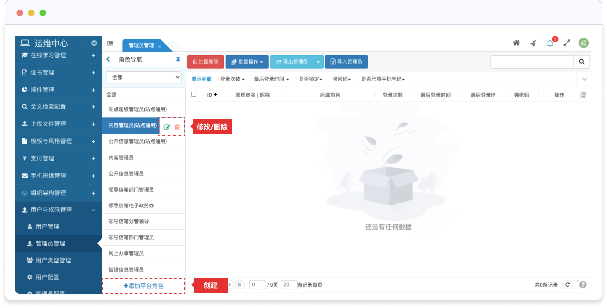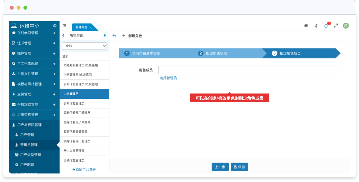 可以在創(chuàng)建/修改角色時指定角色成員,或者在管理員管理時設置管理員的權限(所屬角色)。