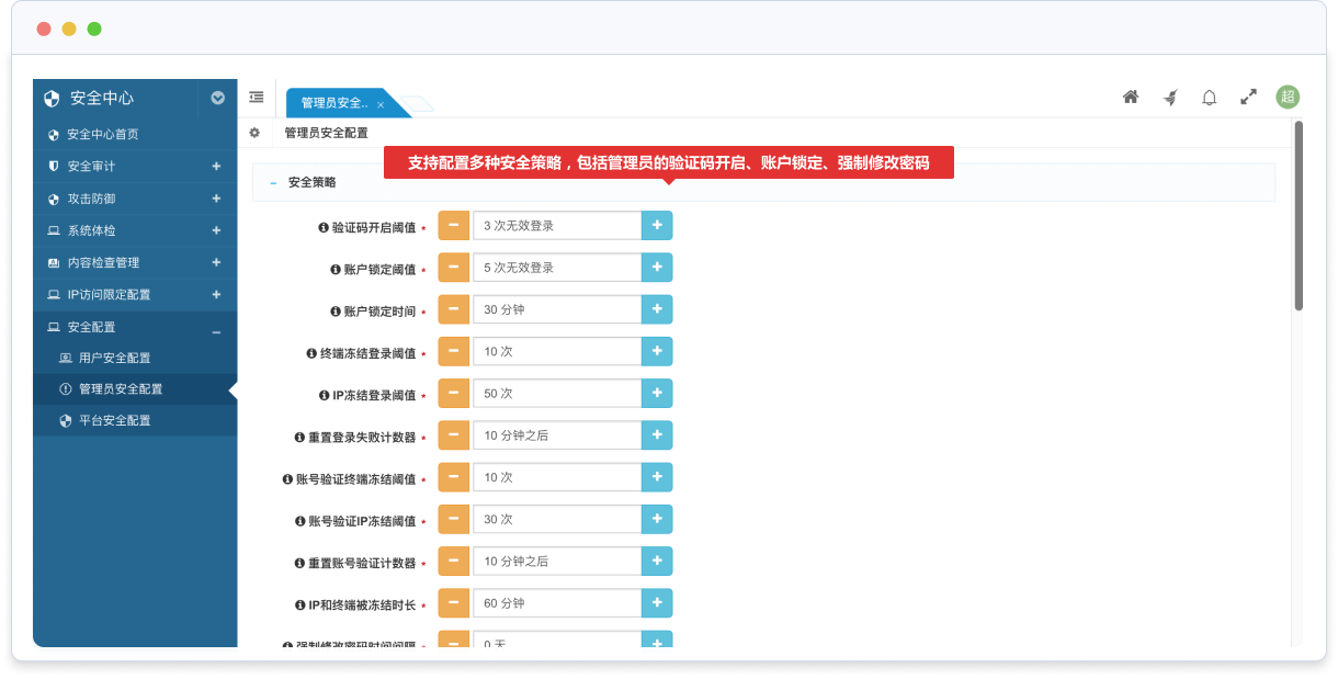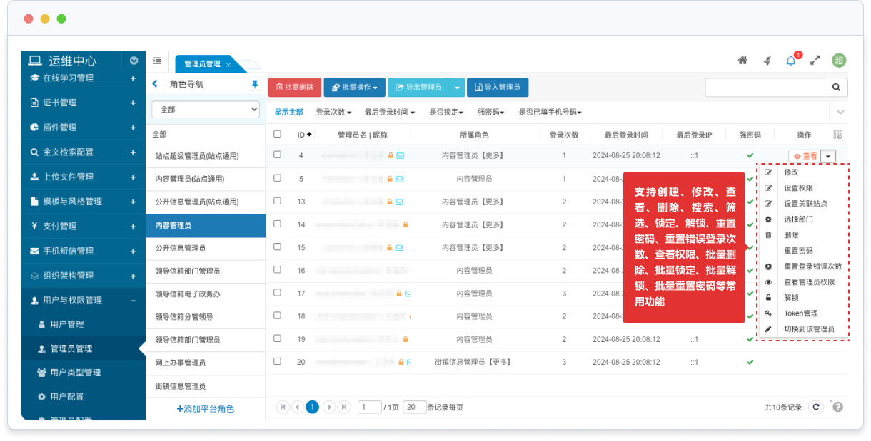支持創(chuàng)建、修改、查看、刪除、搜索、篩選、鎖定、解鎖、重置密碼、重置錯誤登錄次數、查看權限、批量刪除、批量鎖定、批量解鎖、批量重置密碼等常用功能;