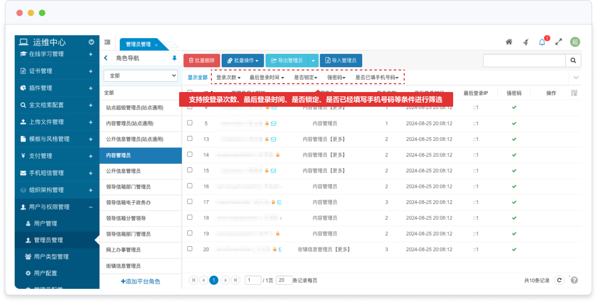 支持按登錄次數、最后登錄時間、是否鎖定、是否已經填寫手機號碼等條件進行篩選;