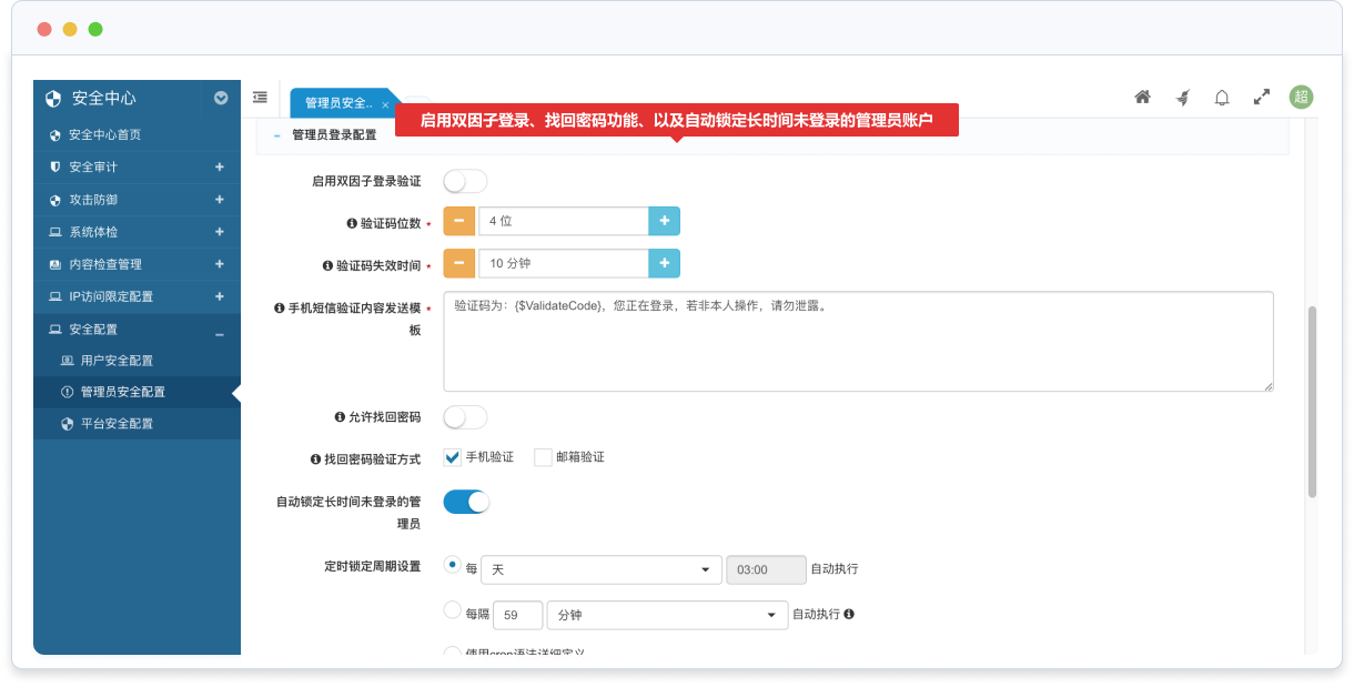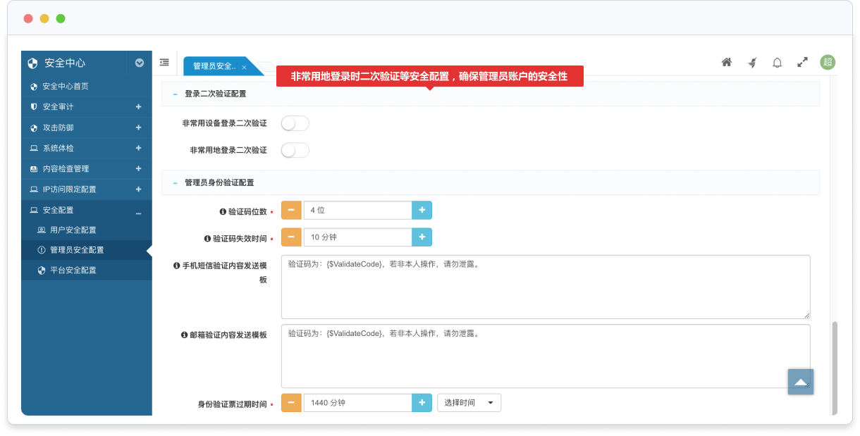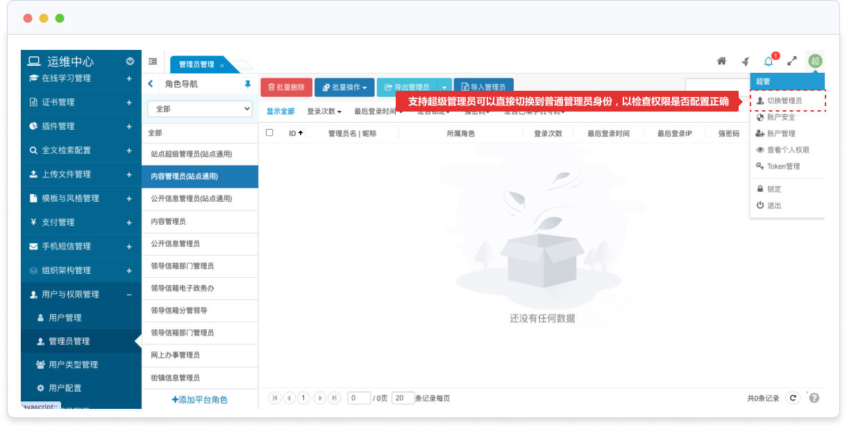 支持超級管理員可以直接切換到普通管理員身份,以檢查權限是否配置正確;