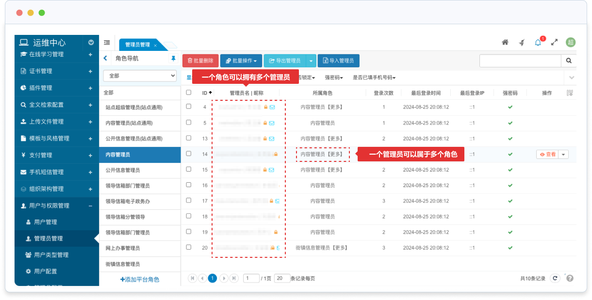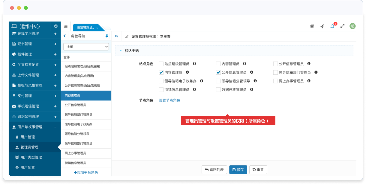 管理員可以歸屬于多個站點,在每個站點中可以屬于不同站點角色,以滿足跨站點管理的業(yè)務需求。