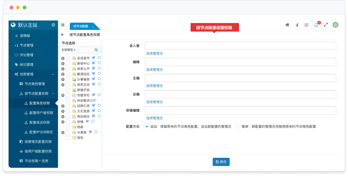- 通過配置各欄目(節(jié)點)節(jié)點角色的管理員,可以為不同欄目指派特定管理員進行管理
