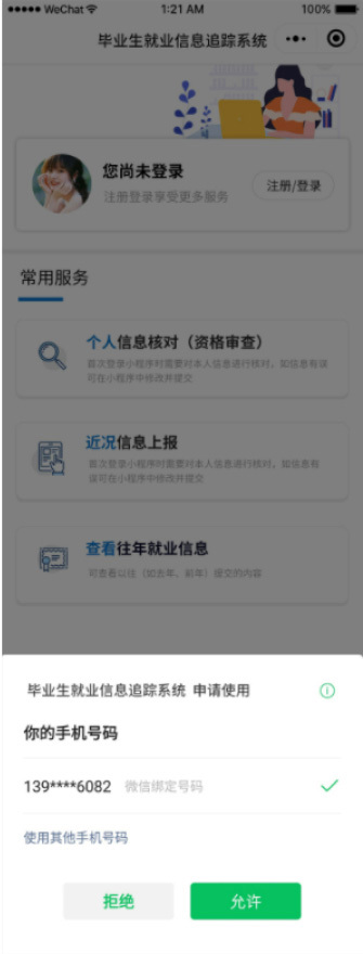 畢業(yè)生登錄小程序學校或班主任利用微信群等多種渠道發(fā)布填報通知,畢業(yè)生接獲通知后,通過掃描通知中二維碼快速進入小程序。小程序自動申請獲取當前微信賬戶關(guān)聯(lián)的手機號信息,并與畢業(yè)生數(shù)據(jù)庫進行精準匹配: