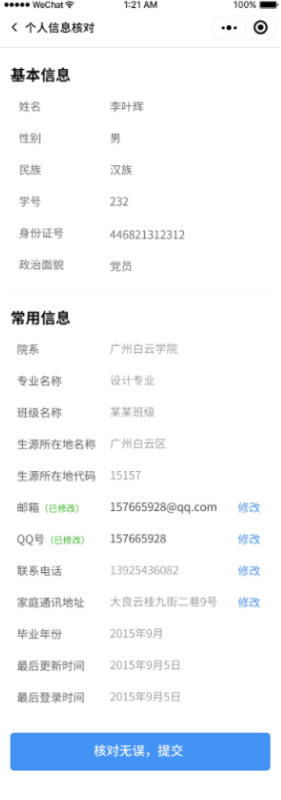 支持畢業(yè)生對本人信息進行核對,如信息有誤可在小程序中修改并提交,院系用戶或輔導員(管理員)將對提交信息進行數(shù)據(jù)審核,系統(tǒng)將自動記錄修改的具體字段及展示修改前后的內(nèi)容對比,以確保數(shù)據(jù)更新的準確性和可追溯性。