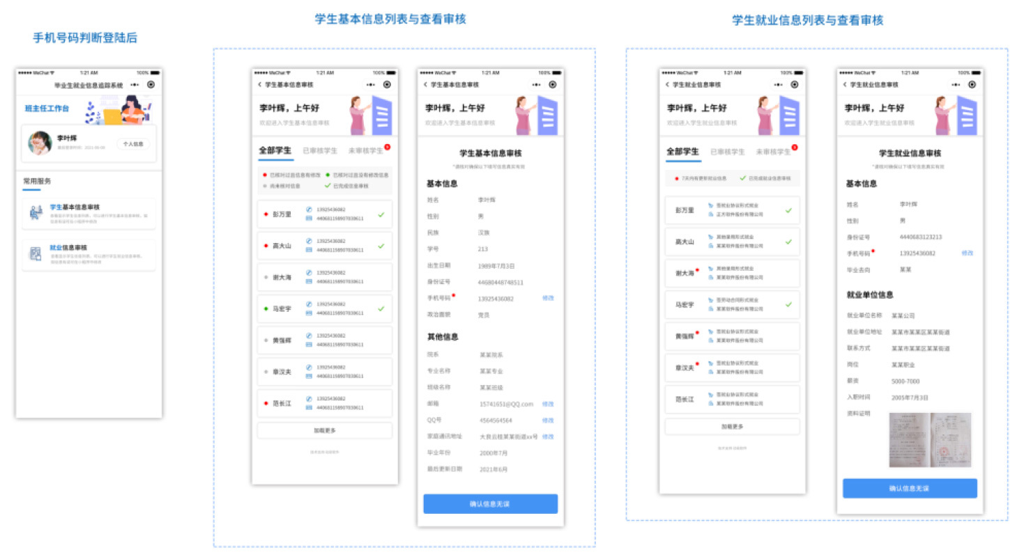 班主任(輔導員)掃碼進入小程序,小程序自動申請獲取當前微信賬號綁定的手機號進行身份驗證,識別并確認班主任身份后,直接進入班主任工作臺界面,班主任能夠進行學生基本信息與就業(yè)信息的審核工作。
