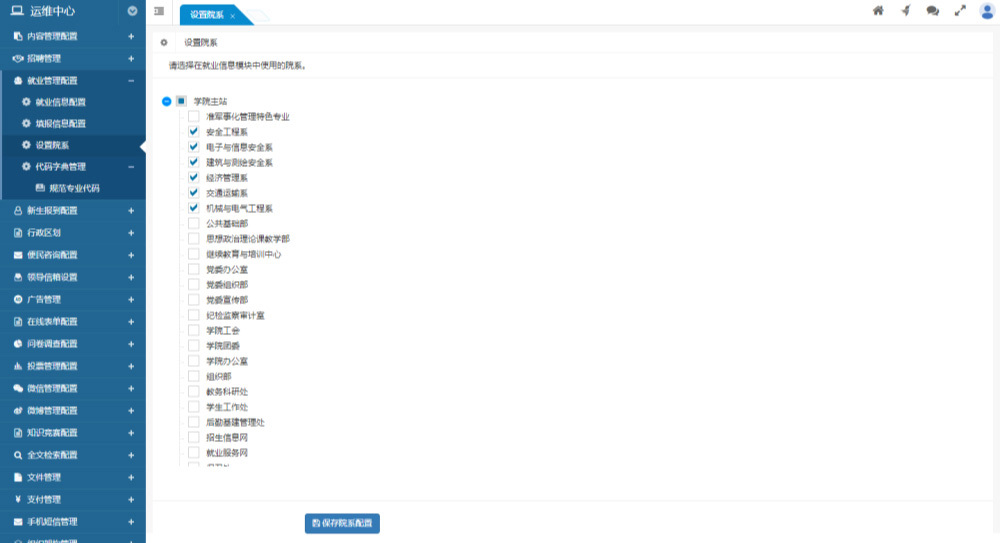 院系、專業(yè)、班級管理院系為全局部門的子集,可以配置全局部門中在就業(yè)信息管理模塊中啟用的部門做為院系。