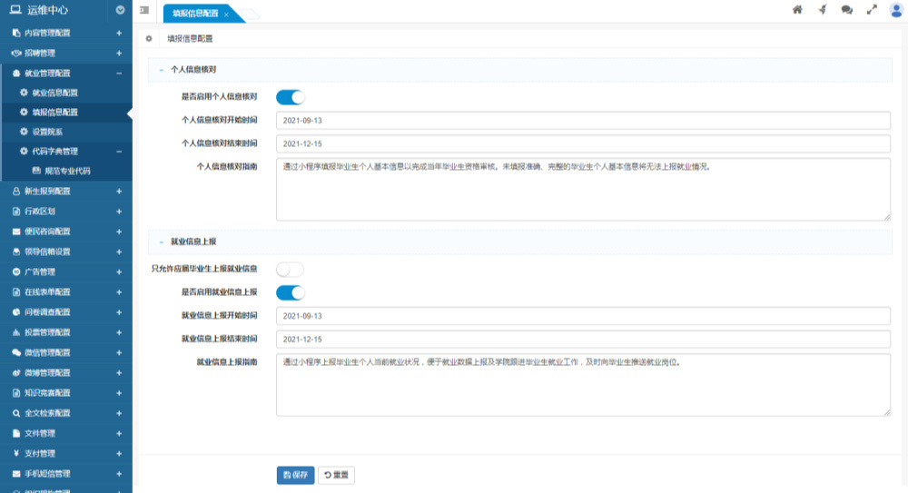 支持設置是否開放信息上報、信息上報的開始時間、截止時間、信息上報小程序中的指南性文字描述等內(nèi)容。