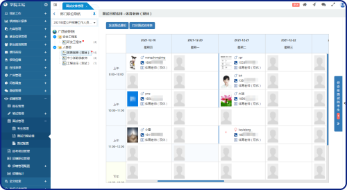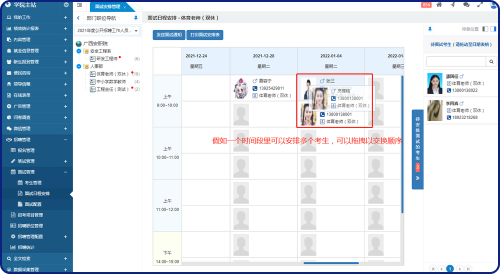 中欄為本次招生考試項目的班級列表,每個班級名稱后顯示相應(yīng)的進(jìn)入面試流程的考生總數(shù),假如有“待安排面試時間”的考生,則用紅點進(jìn)行提醒。右側(cè)為待安排面試考生列表,中間為面試日程安排表。