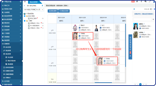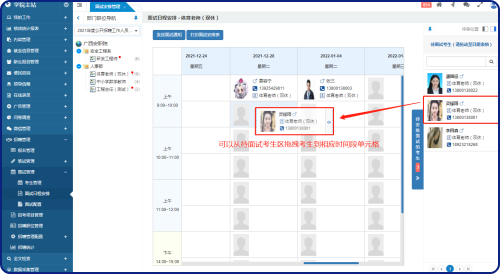 在這個面試日程安排界面中,可以將“待安排考生”拖拽到未安排面試的時間段的單元格中;可以拖拽考生從一個時間段到另一個時間段;假如一個時間段里有多個考生,可以拖拽考生進(jìn)行排序;已安排好的考生,可以移除以重新安排。