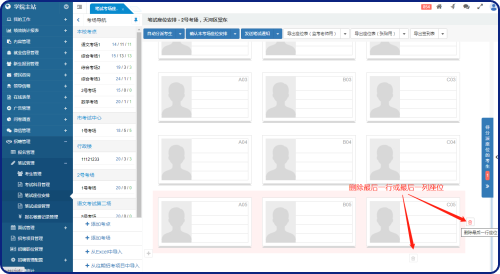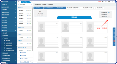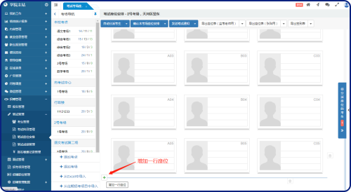 考點和考場管理不需要專門的菜單,直接在“筆試座位安排”的考場導(dǎo)航中欄進(jìn)行管理。