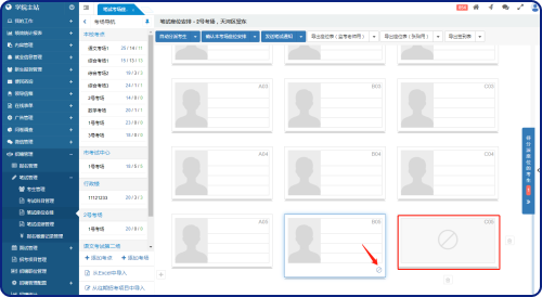 筆試考生管理的界面與報名管理類似,中欄為本次招生考試項目的班級列表,每個班級名稱后顯示相應(yīng)的進(jìn)入筆試流程的考生總數(shù),假如有“待安排座位”的考生,則用紅點進(jìn)行提醒。中欄頂部支持切換招生考試項目。