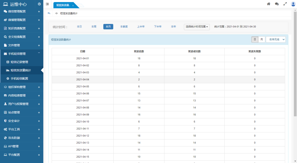 提供按日和按月兩種統(tǒng)計表。統(tǒng)計每日/每月發(fā)送的短信發(fā)送總量、發(fā)送成功數(shù)量、發(fā)送失敗數(shù)量。便于與短信服務(wù)商進行對帳。