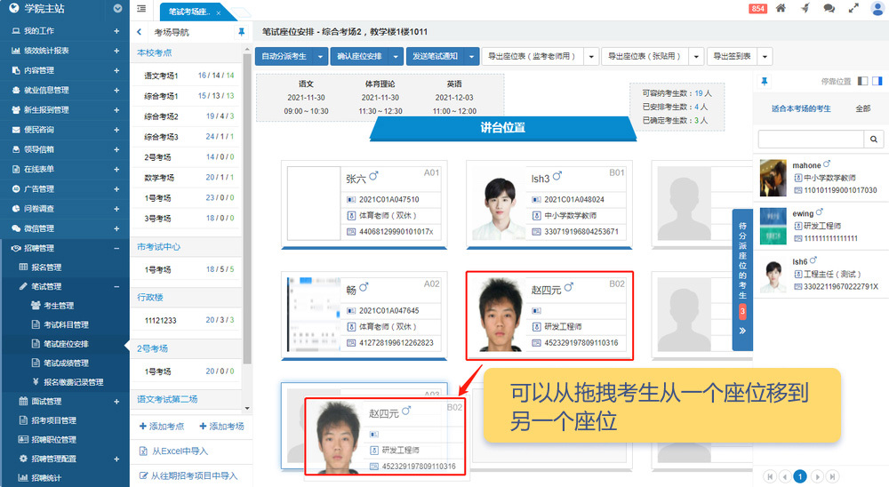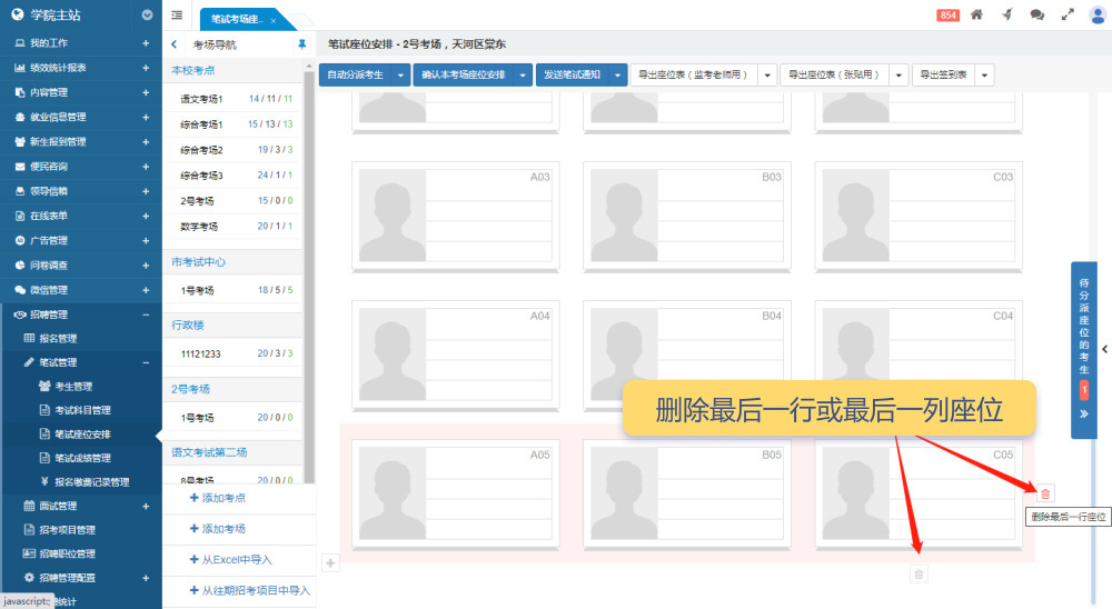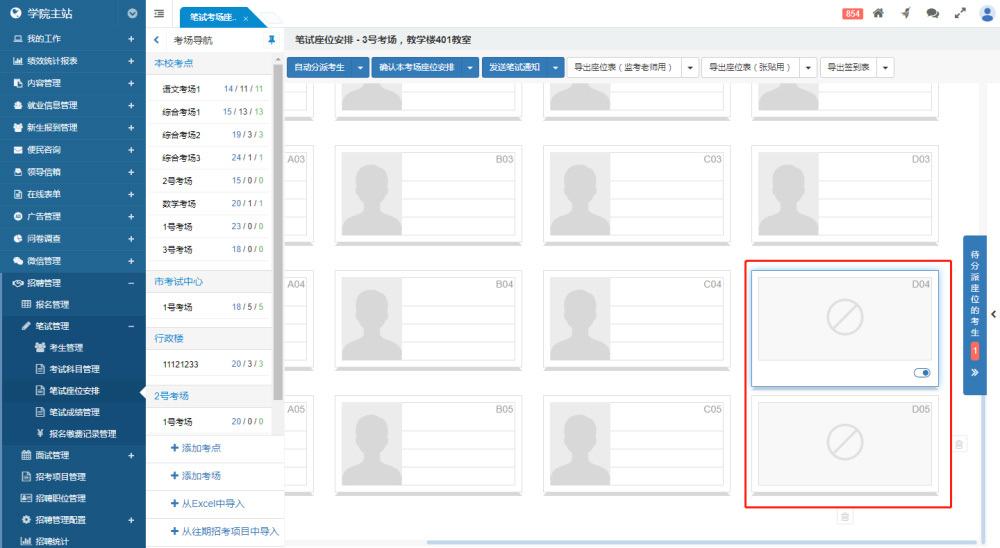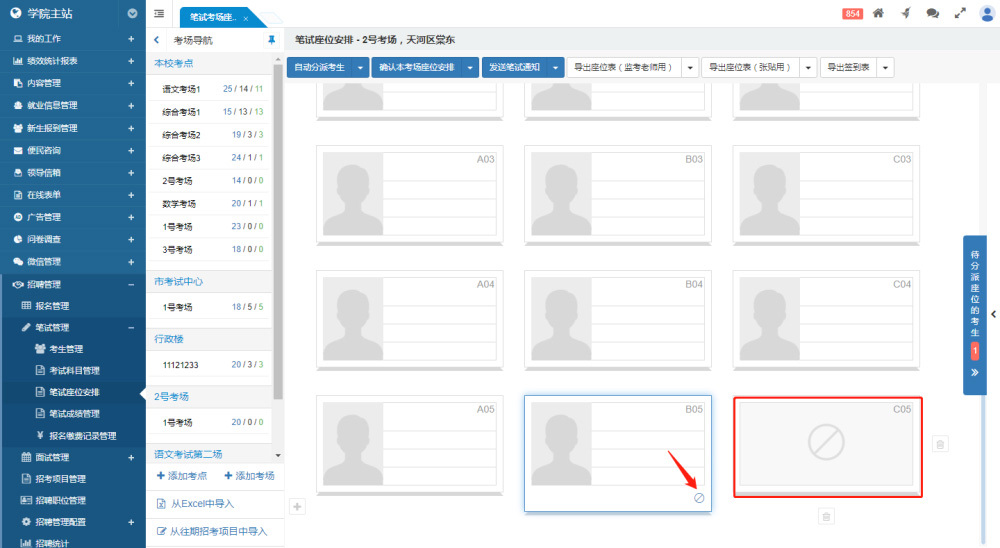 在后臺(tái)管理界面中,中欄顯示考點(diǎn)和考場(chǎng)導(dǎo)航信息。右側(cè)展示座位安排表,以所見(jiàn)即所得的方式顯示每個(gè)座位的考生信息。同時(shí),右側(cè)還包含“待分派座位的考生”區(qū)域(僅在有待分派考生時(shí)顯示)。